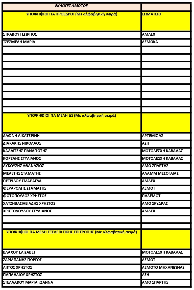 Αναρτήθηκε η λίστα των υποψηφίων για τις προσεχής αρχαιρεσίες της ΑΜΟΤΟΕ.