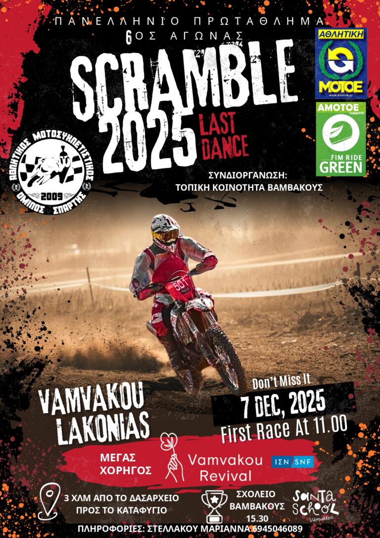 Το αθλητικό σωματείο ΑΜΟΣ (ΣΠΑΡΤΗ)  με αριθμό Αθλητικής Αναγνώρισης ΦΧ62 μετά από έγκριση της Α.ΜΟΤ.Ο.Ε διοργανώνει την 7/12/2025 τον 6ο Αγώνα του Πανελλήνιου Πρωταθλήματος SCRAMBLE για το έτος 2025. Δηλώστε συμμετοχή ΕΔΩ
